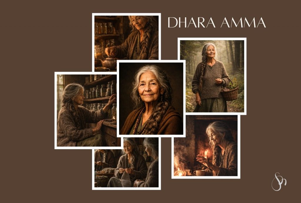 She’s in her late 80s. Long silver-brown hair, always braided. Her eyes are deep brown, warm, steady – like soil after rain. Her skin carries the marks of sun and time. Her clothes are made of wool, linen, natural fibers. Earth tones. Always simple, always intentional.